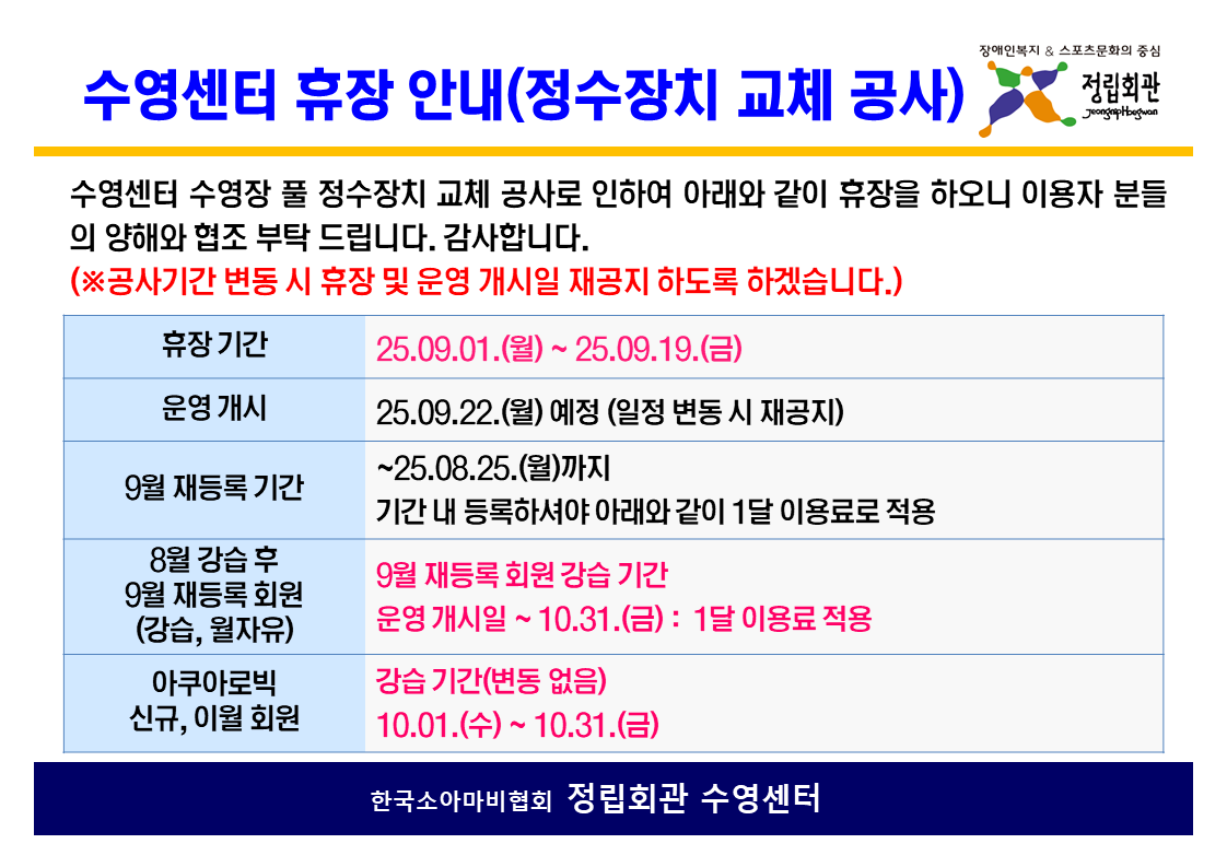 [¼ö¿µ¼¾ÅÍ] 2025³â 9¿ù ÈÞÀå ¾È³»(Á¤¼öÀåÄ¡ ±³Ã¼°ø»ç)