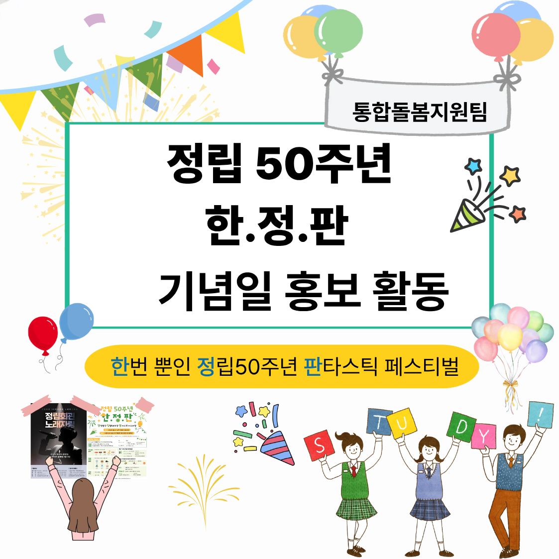 | [ÅëÇÕµ¹º½Áö¿øÆÀ] Á¤¸³È¸°ü 50ÁÖ³â ÇÑ.Á¤.ÆÇ È«º¸È°µ¿ | ||||||||||||